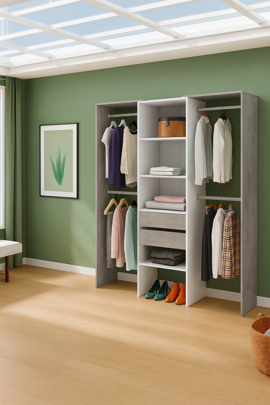 Armario vestidor abierto con estanterías y barras de colgar. Diseño práctico y versátil para organizar tu ropa, fabricado en melamina de alta calidad.