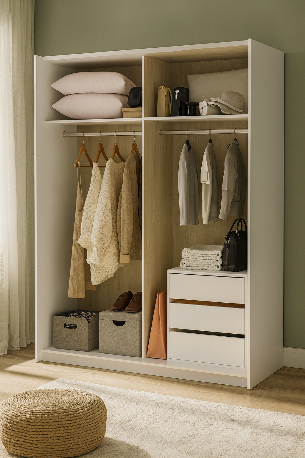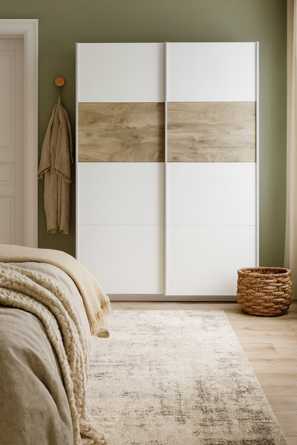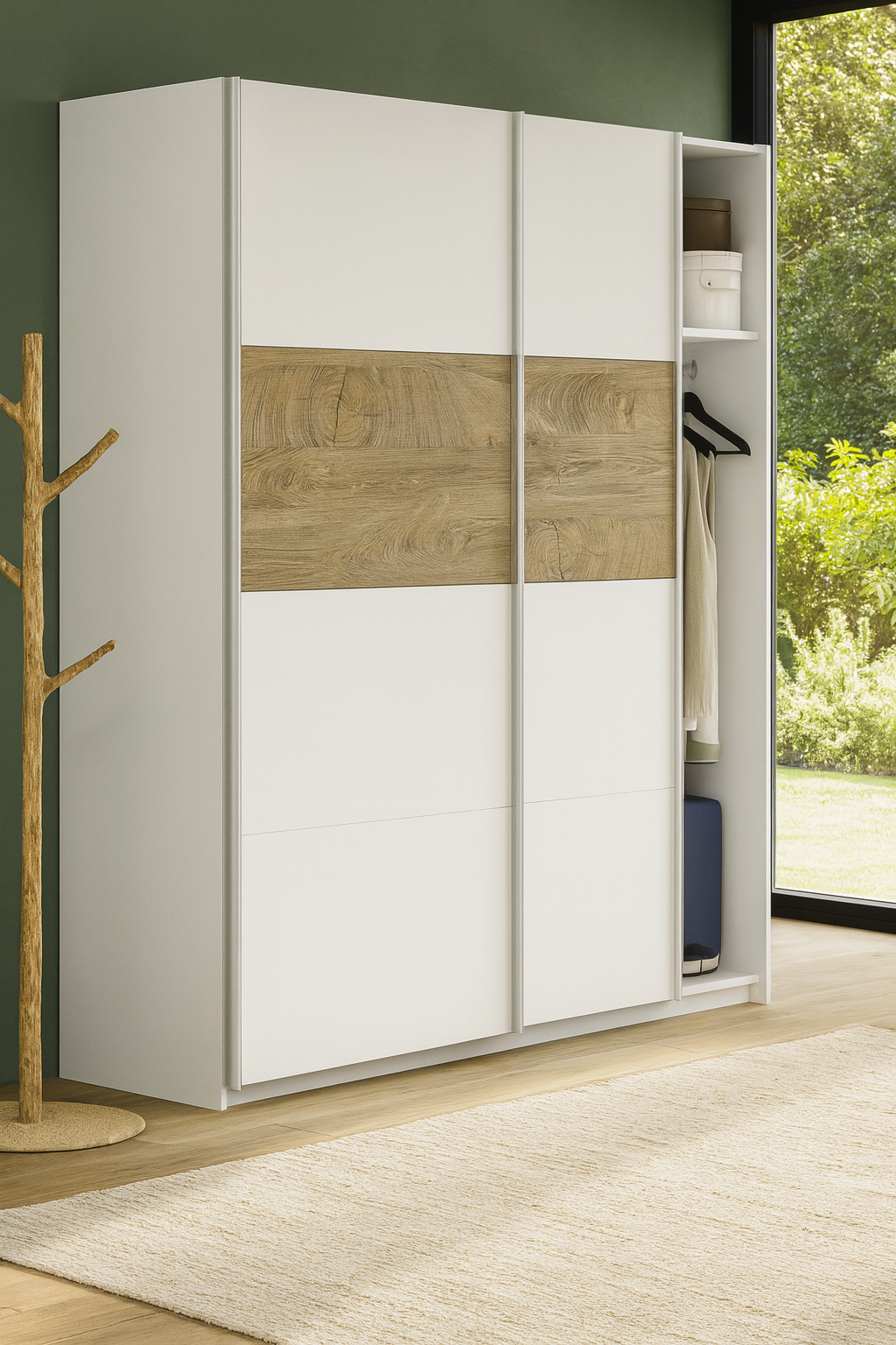 Armario de dos puertas acabado blanco/pizarra, pensado para optimizar el espacio del dormitorio con un estilo contemporáneo y práctico.
